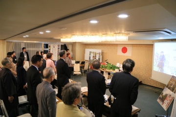 会場には国旗がかかげられています。そして毎回会の前に行っているという国歌斉唱を一同を行い会が始まりました。日本を愛し日本を大事に思っている皆さま、とても素晴らしいことだと思います。