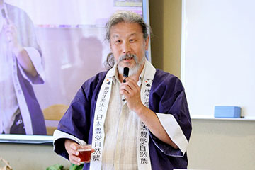 午後は静岡函南農場から農場従事者、リーダーの吉田誠さん、大脇さん、食品加工部から松永さんを招いて、作り手の思いをお話頂きました。多種多様な作物を栽培している豊受農場では、身体にありがたいものを恵んでくれる自然のものすべてに、感謝の気持ちをベースとして、種や固定種・在来種にこだわり、「豊受の自然型農業」も「食」の改革に取り組んでいこうと日々精進しているとの事。そして、日本人の「心」・「身体」・「魂」の真の健康を願い、皆様に自然で「安心」「安全」なものを食べたり使っていただくために 絶え間なく、弛まぬようにやっていきたいとの熱い思いが語られました。