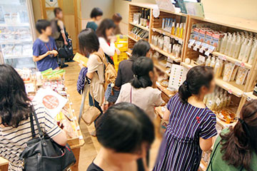 昨今の異常気象にも関わらず、豊受自然農では夏野菜が豊作でしたので、謝恩セールとして自然農の空芯菜が一束100円などで提供され、豊受自然農の野菜などを求める方々や今日から発売される『幸せに生きられるZENホメオパシー2 病原体とインナーチャイルド[DVD]』などを入手しようとする人々でとてもにぎわいました。