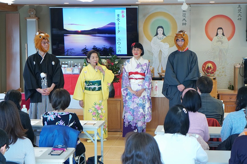 最初にとらこ先生と共に豊受家族の皆さんも着物姿で登場。それぞれの個性あふれる新年のご挨拶で幕を開けました。