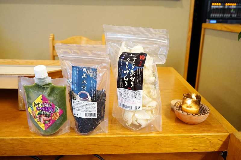 豊受商品:黒米茶、サラダおかきカラダげんき、パイナップルとさつまいものスムージー